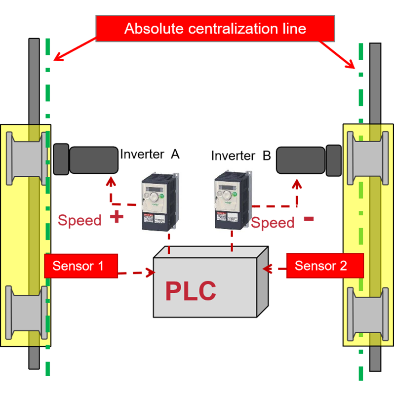 The system is composed of sensors, a PLC (Programmable Logic Controller), and an inverter. Sensors on each side of the end carriage?continuously monitor any deviation from the absolute center reference line in real-time and provide feedback to the PLC.